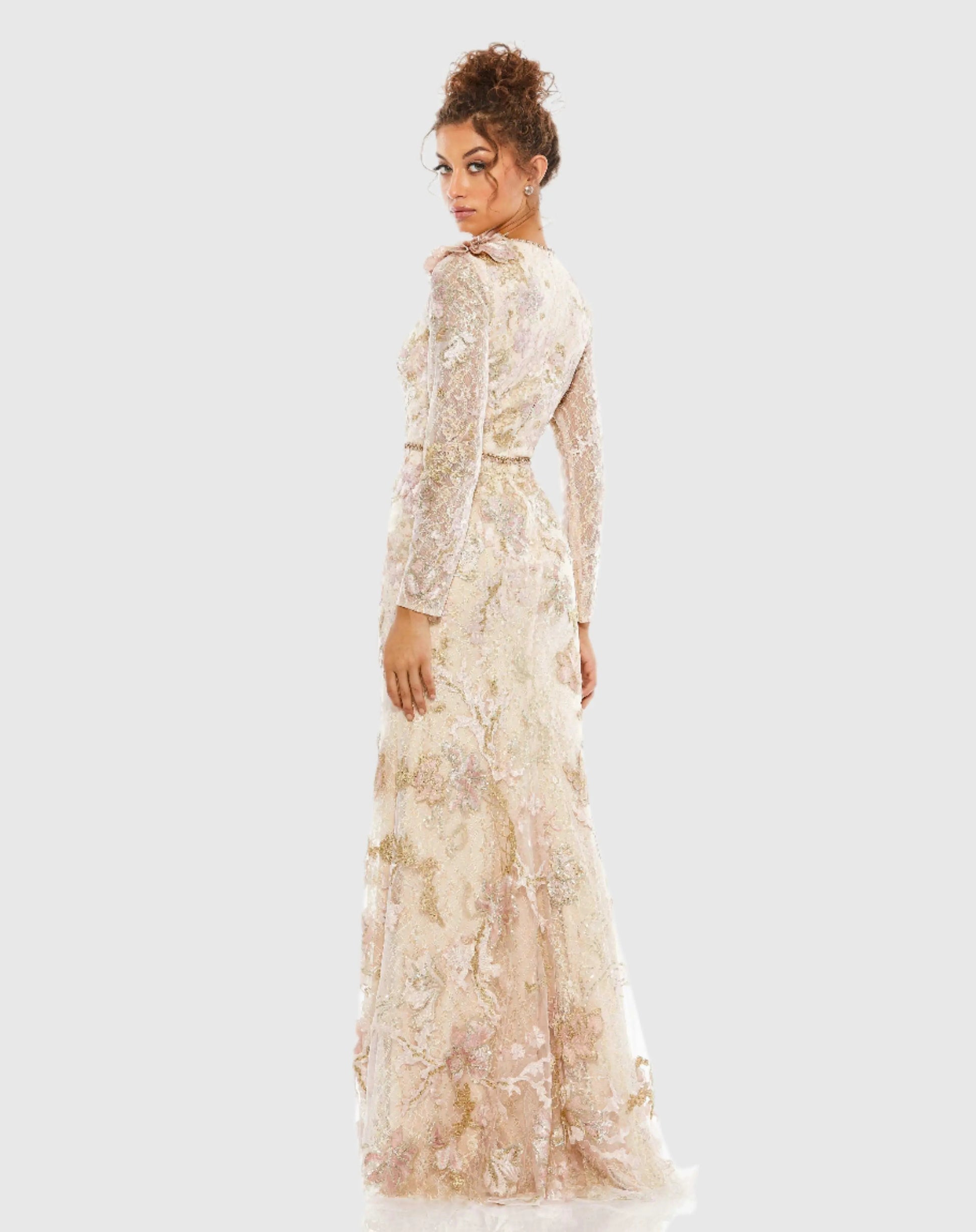 Elegant floral embroidered long sleeve lace trumpet gown with a beaded waist and a one-shoulder 3D floral accent.