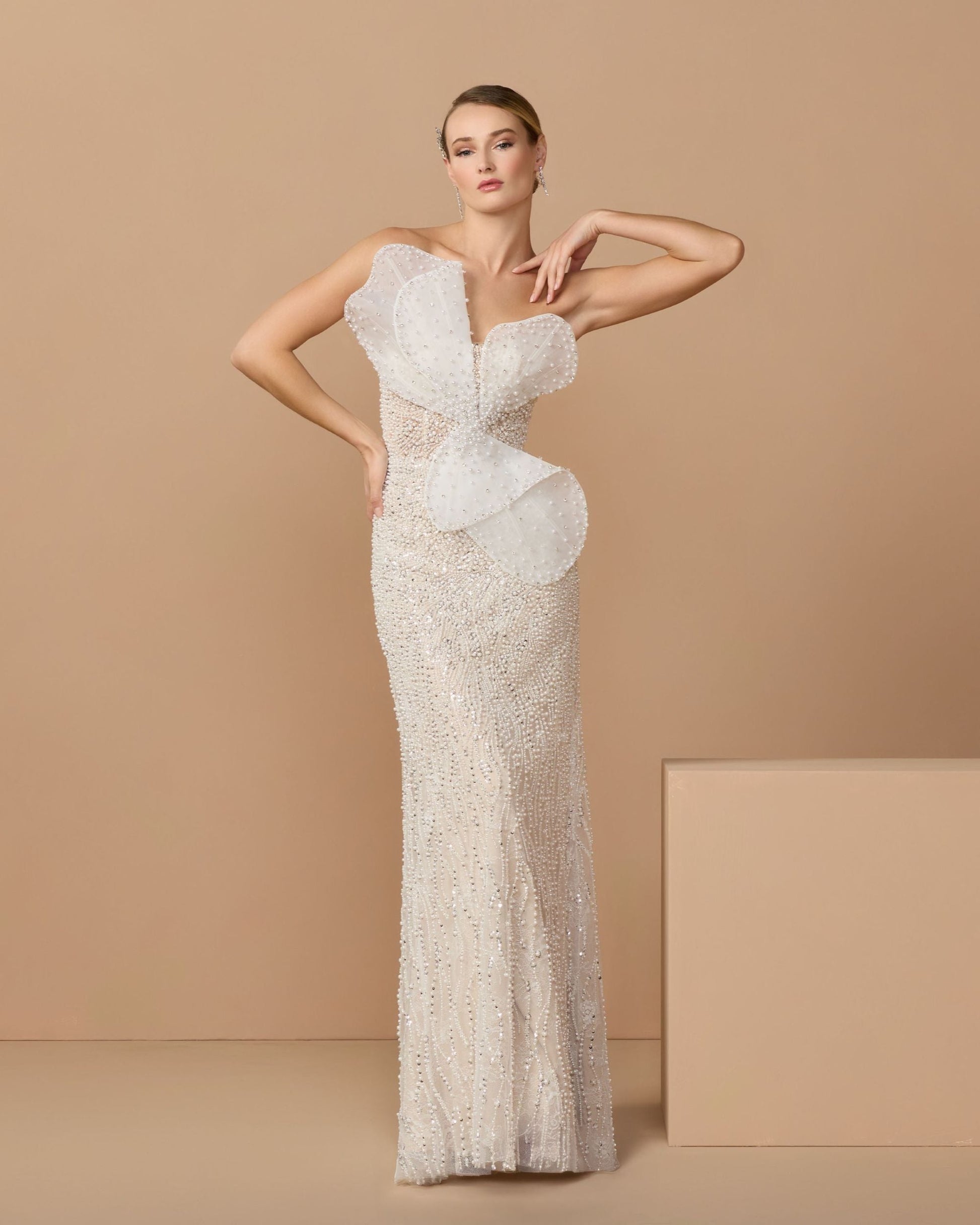 A show stopping ivory embellished column gown with sculptural organza appliqué, a sheer corseted bodice, and luminous hand-beaded pearl and sequin detailing; a striking choice for red carpet and bridal moments.