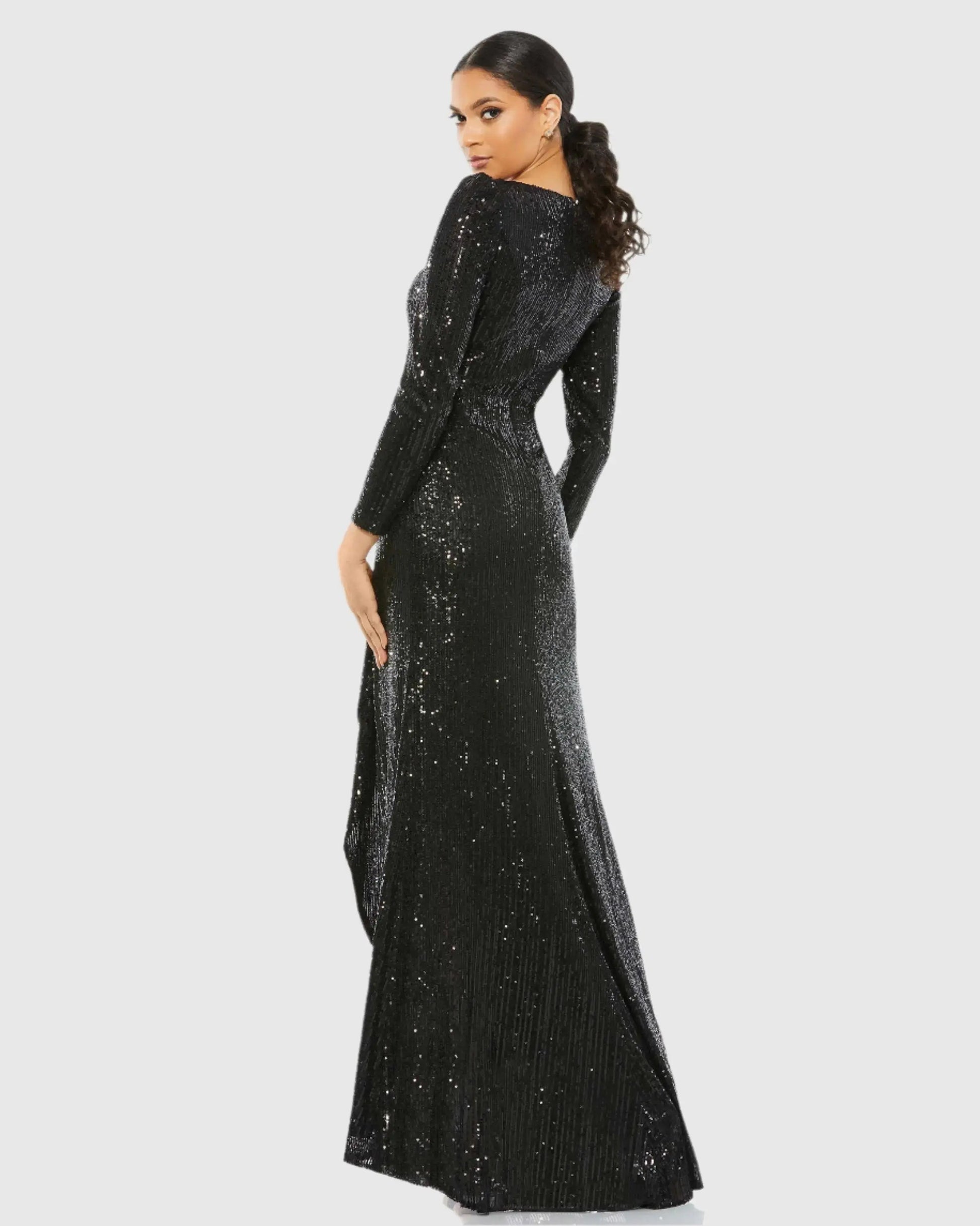 Black Faux Wrap Long Sleeve Sequin Gown