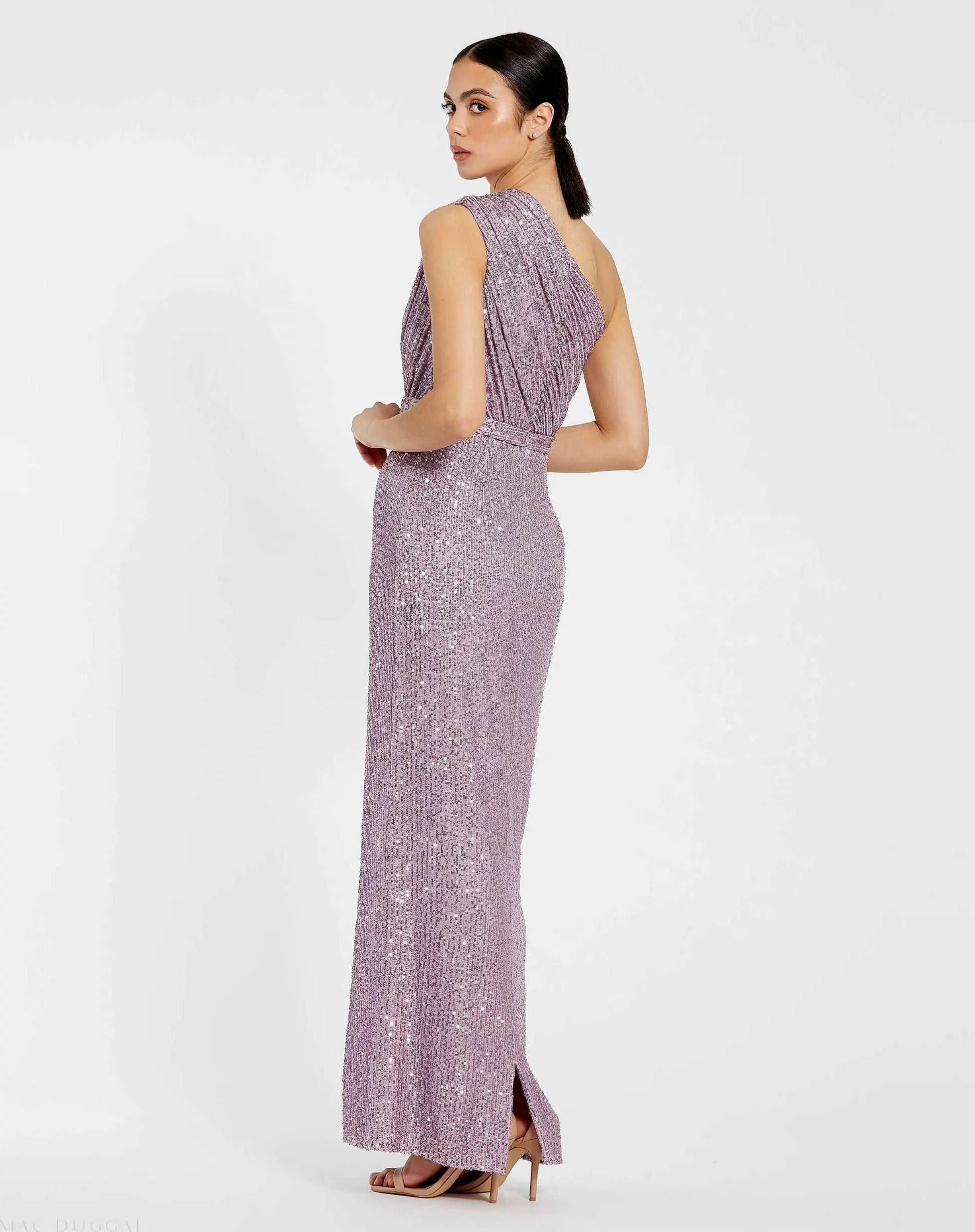 Illuminate the night in our Sequined Ruched One Shoulder Gown, crafted from dazzling sequin fabric, this gown is a show-stopping look. Featuring a chic one-shoulder neckline and sleeveless design, it's your go-to for making a statement at any special occasion.