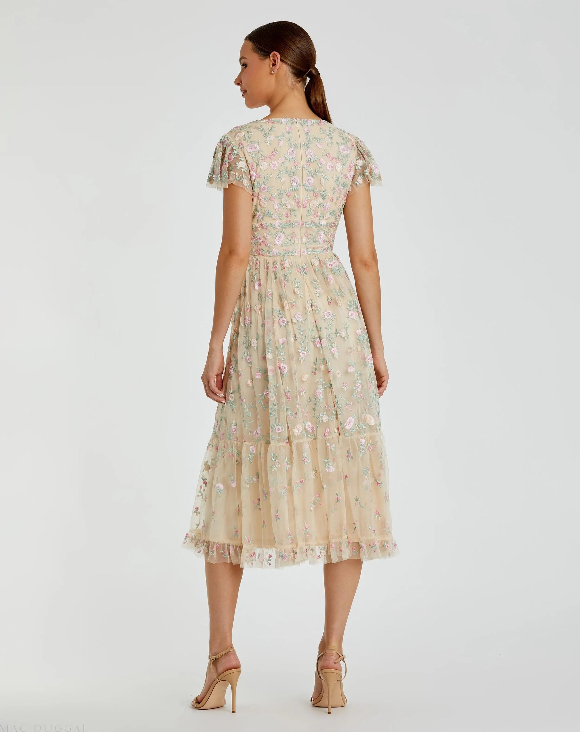 Make an entrance in this stunning embroidered mesh dress, featuring a flattering v-neckline, and delicate ruffle cap sleeves. The allover floral embroidery adds a romantic touch, perfect for garden parties, weddings, and cocktail events.
