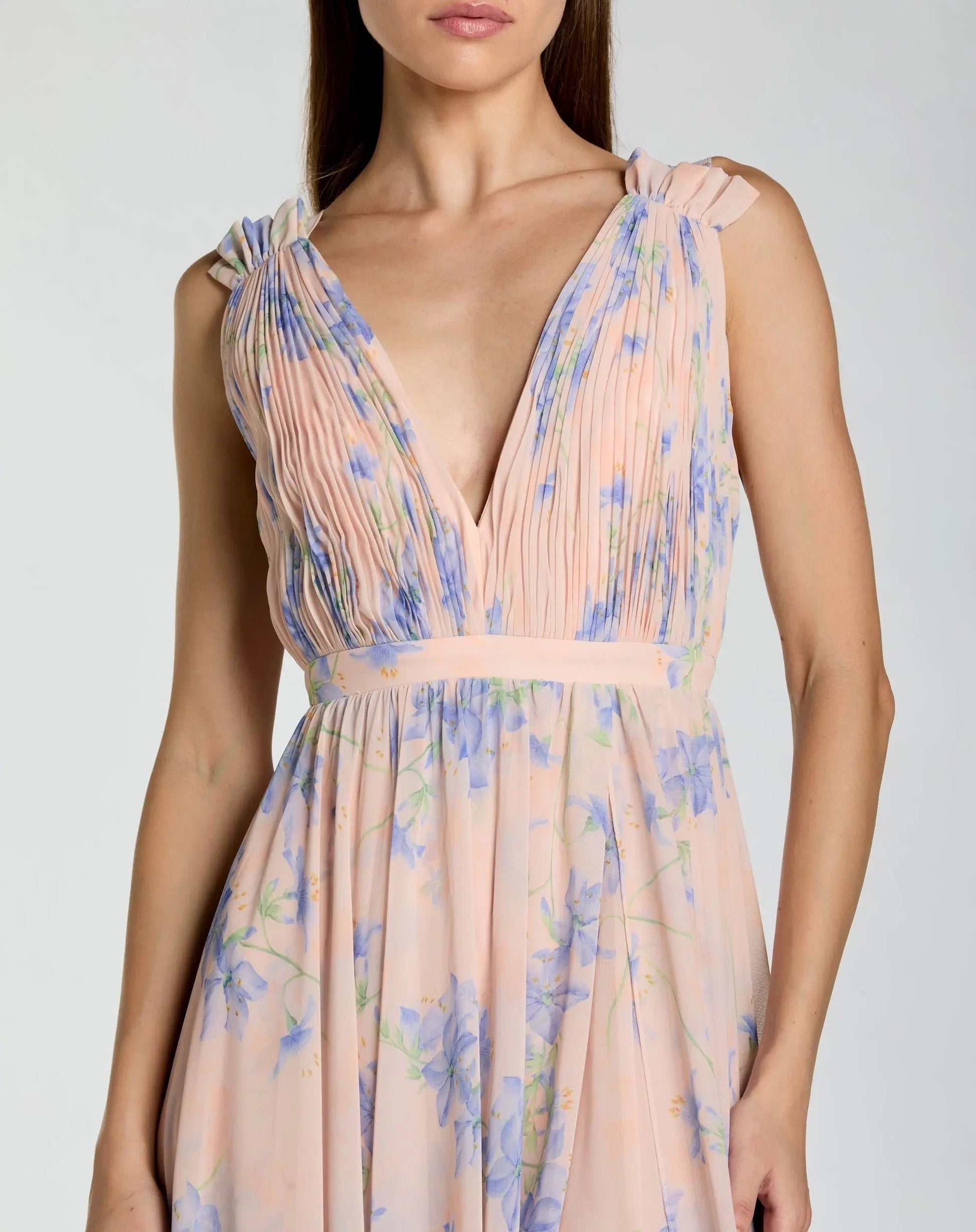Pink Sleeveless Pleated Floral Print Chiffon V-Neck Gown
