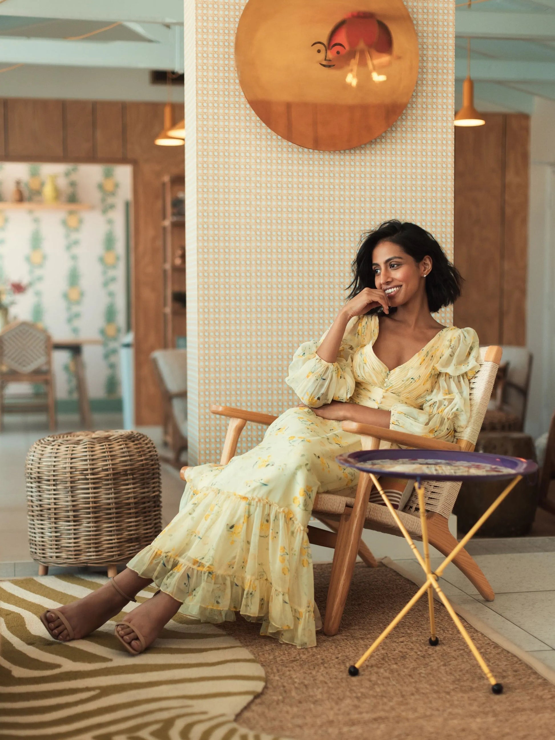 Yellow Floral Print Chiffon Illusion Tiered Puff Dress