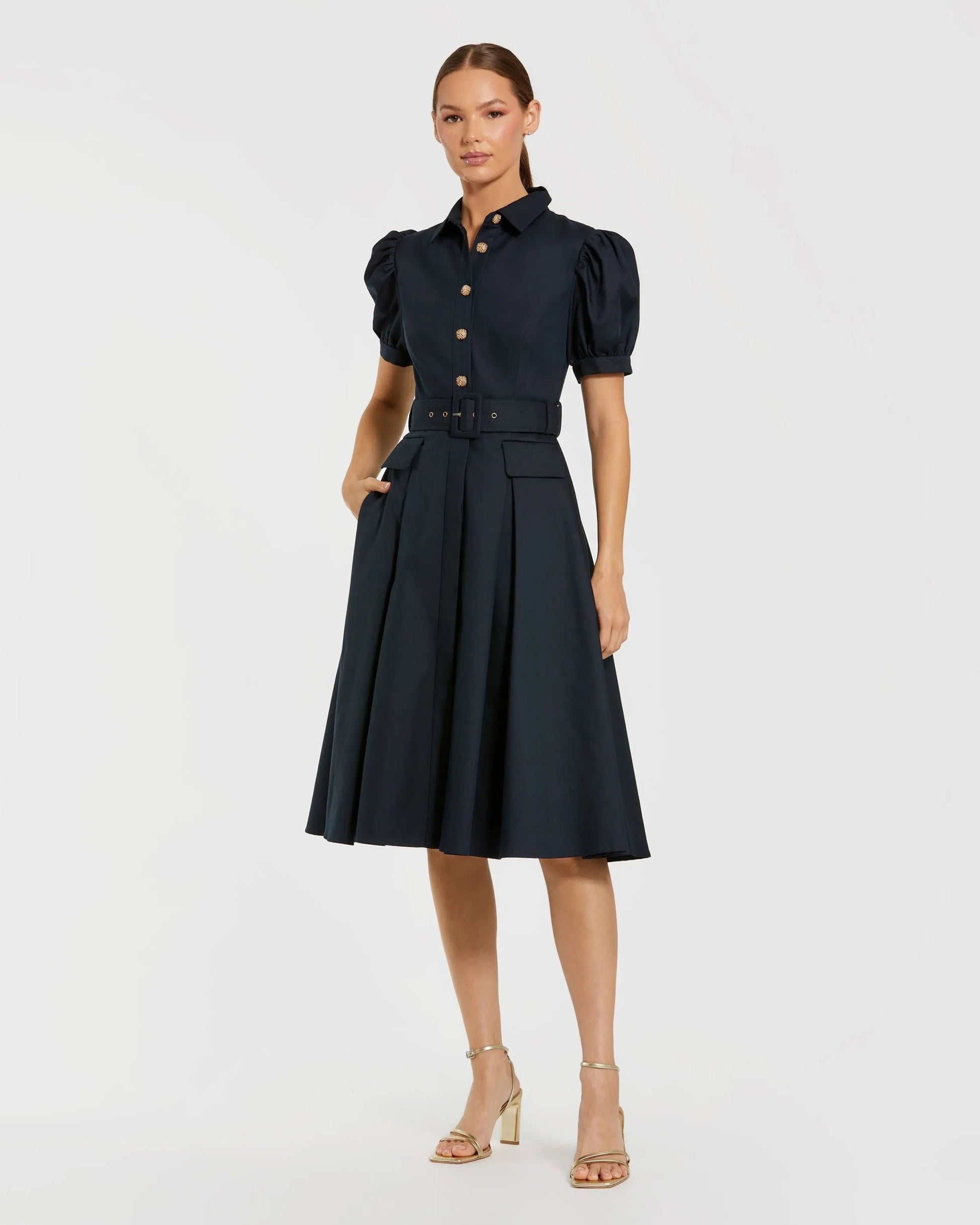 Navy Puff Sleeve Belted Midi Shirt Dress