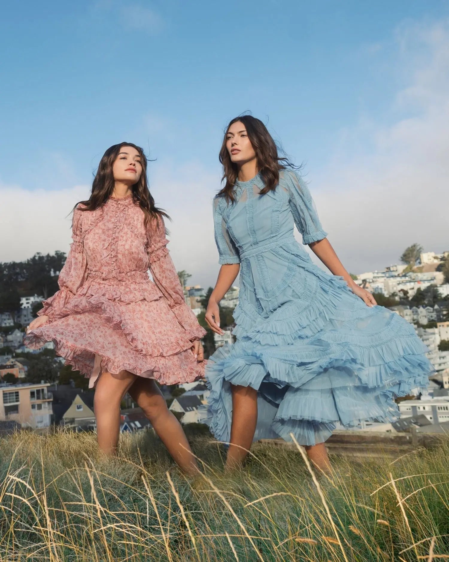 An a-line midi dress with a high neckline, 3/4 sleeves, and tiered ruffles for a graceful, modern silhouette. Perfect for garden parties, brunches, and daytime events.