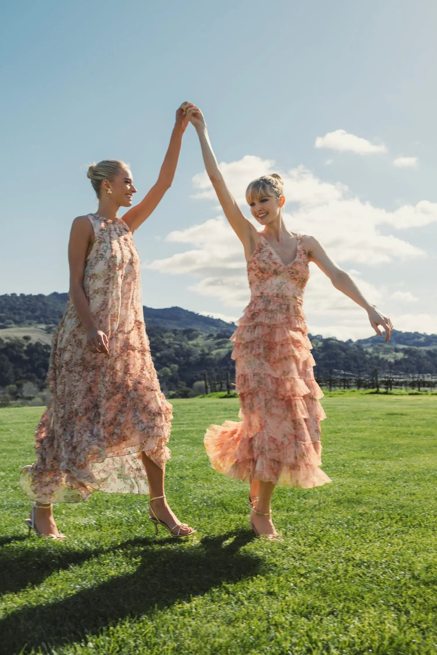 Pink Sleeveless V Neck Floral Mesh Ruffle Midi Dress