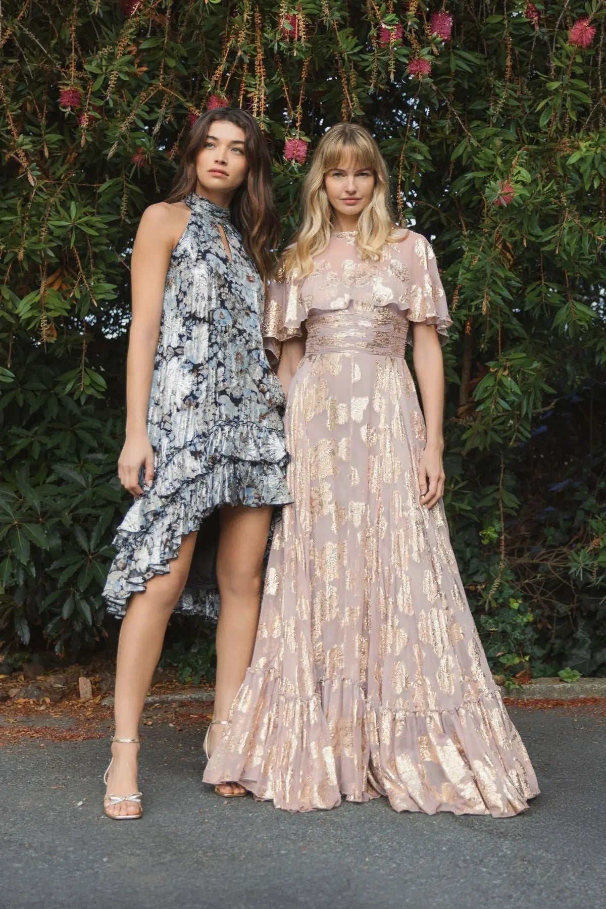 This stunning chiffon mini dress features a high neckline with a keyhole cutout, adding a modern and sophisticated touch. A button closure provides a refined detail, while the high-low ruffle hemline creates dynamic movement. The contemporary metallic floral pattern brings bold, glamorous style, making this dress an ideal choice for daytime events and parties.