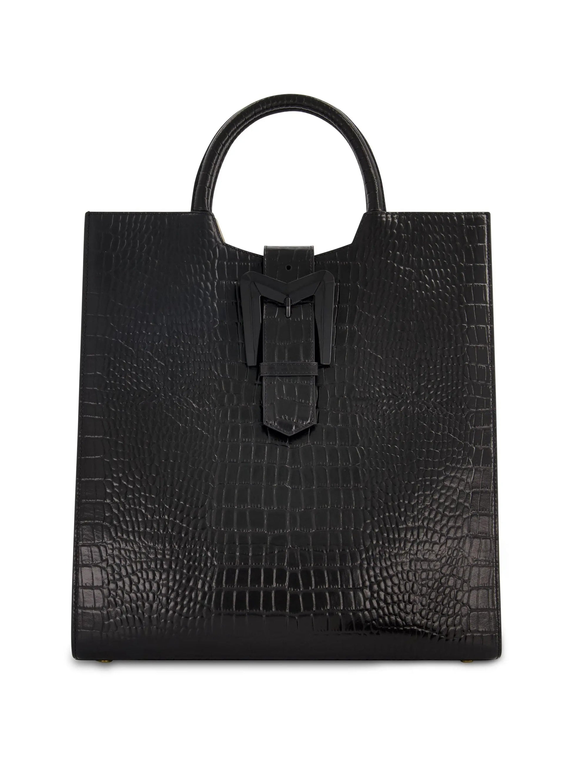 Black Buckled Maxi Croco Leather Tote Bag