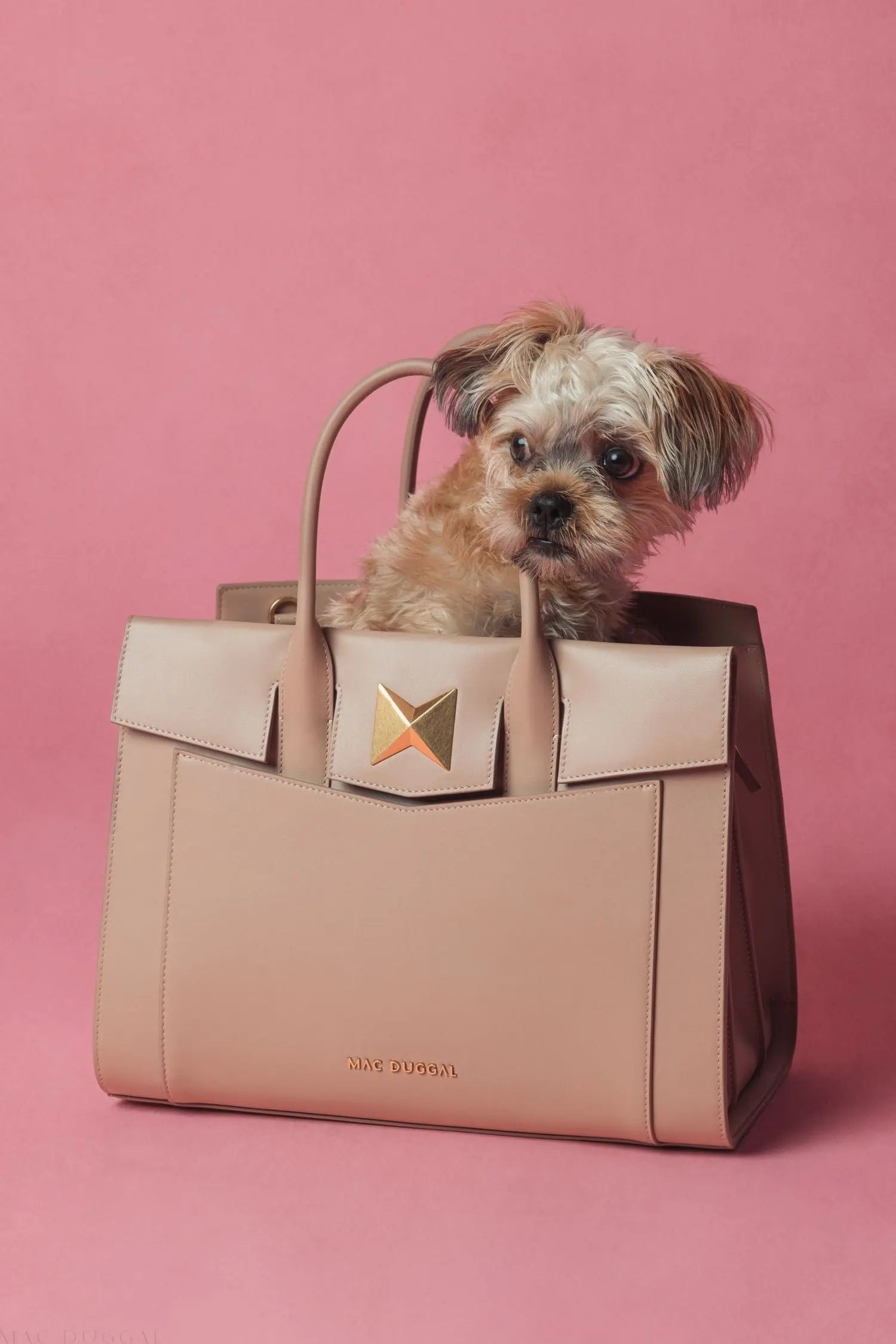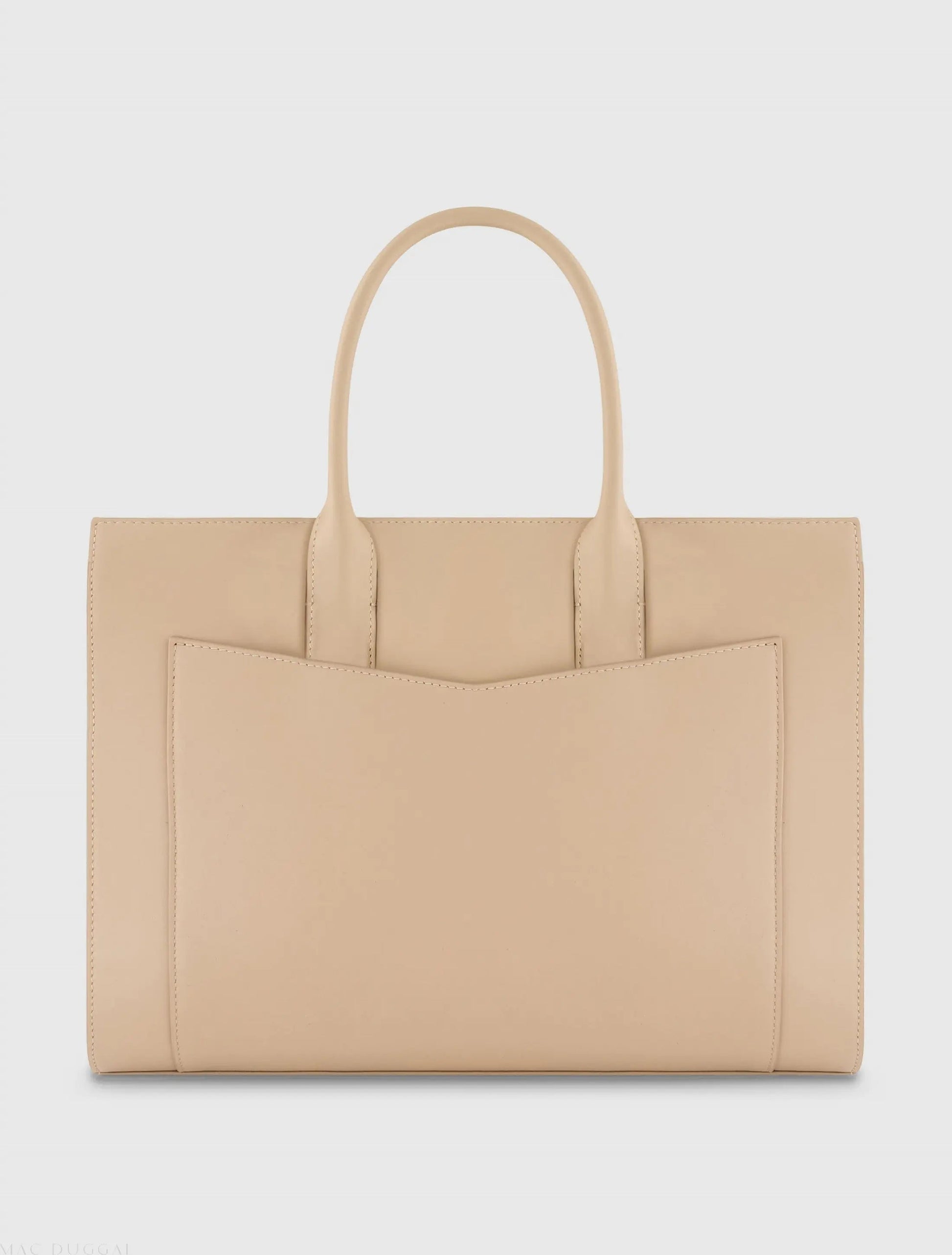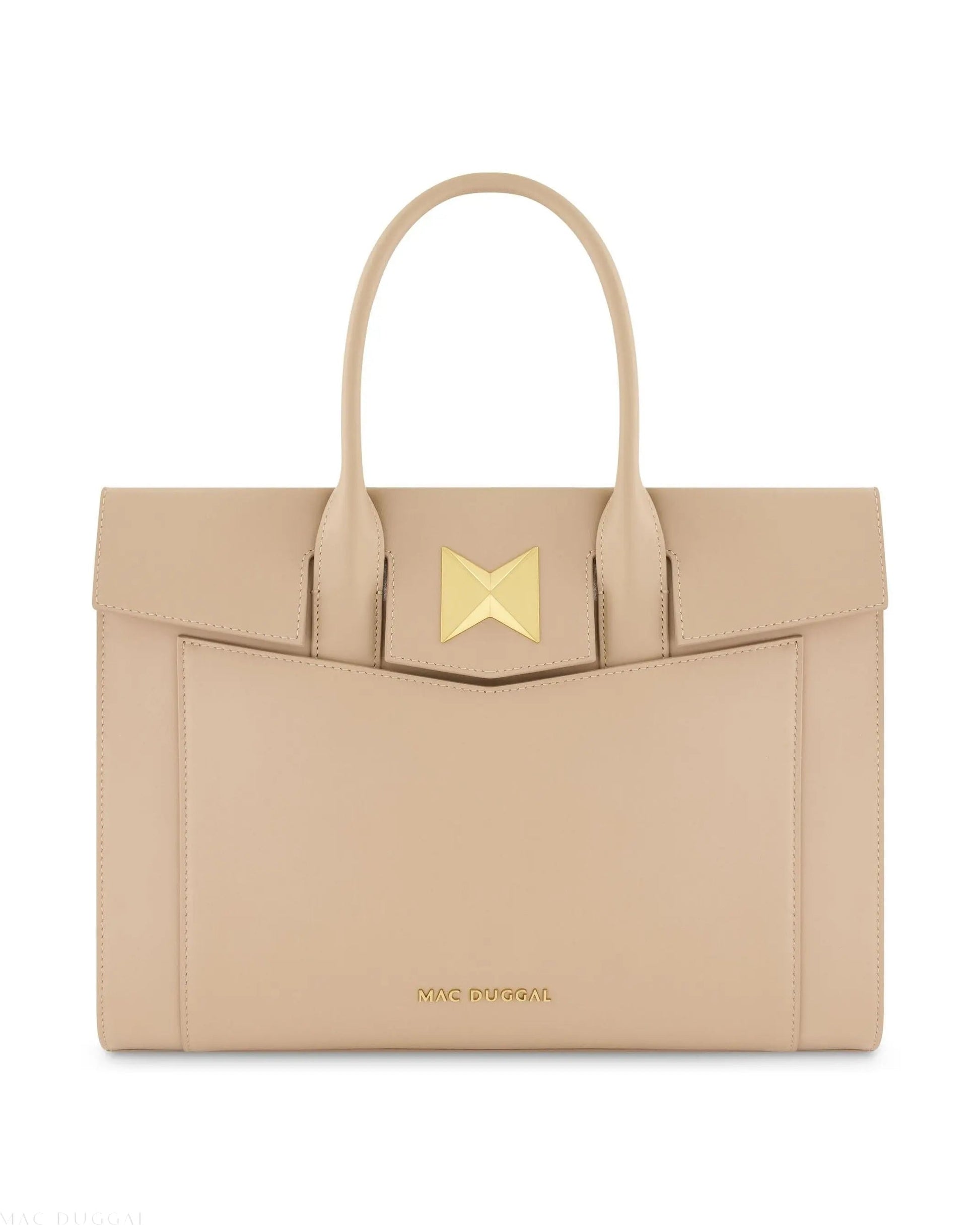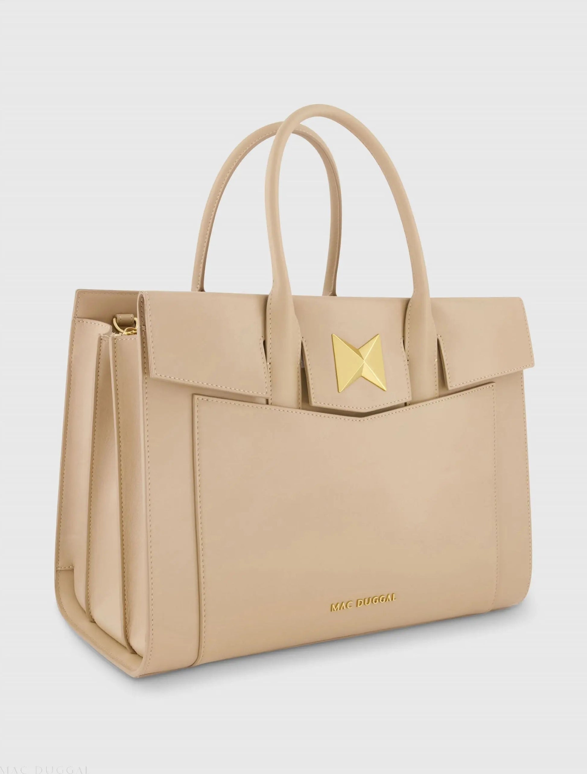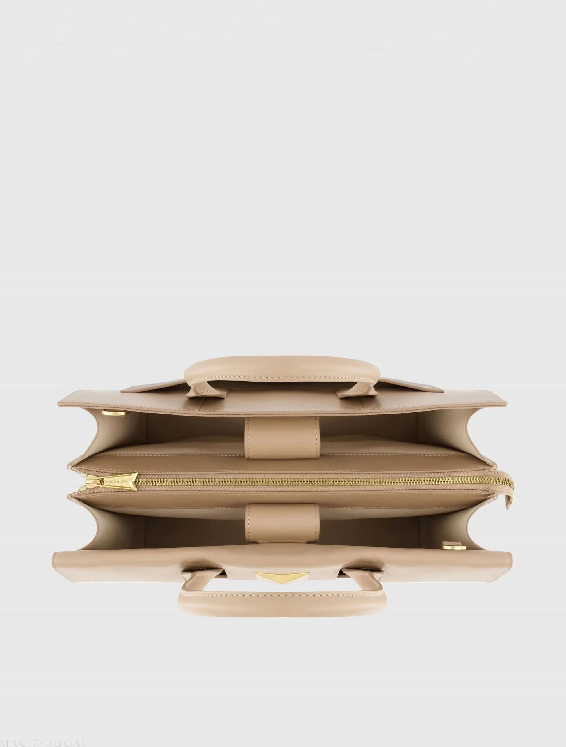 Beige Large Leather Briefcase Bag With Gold Hardware