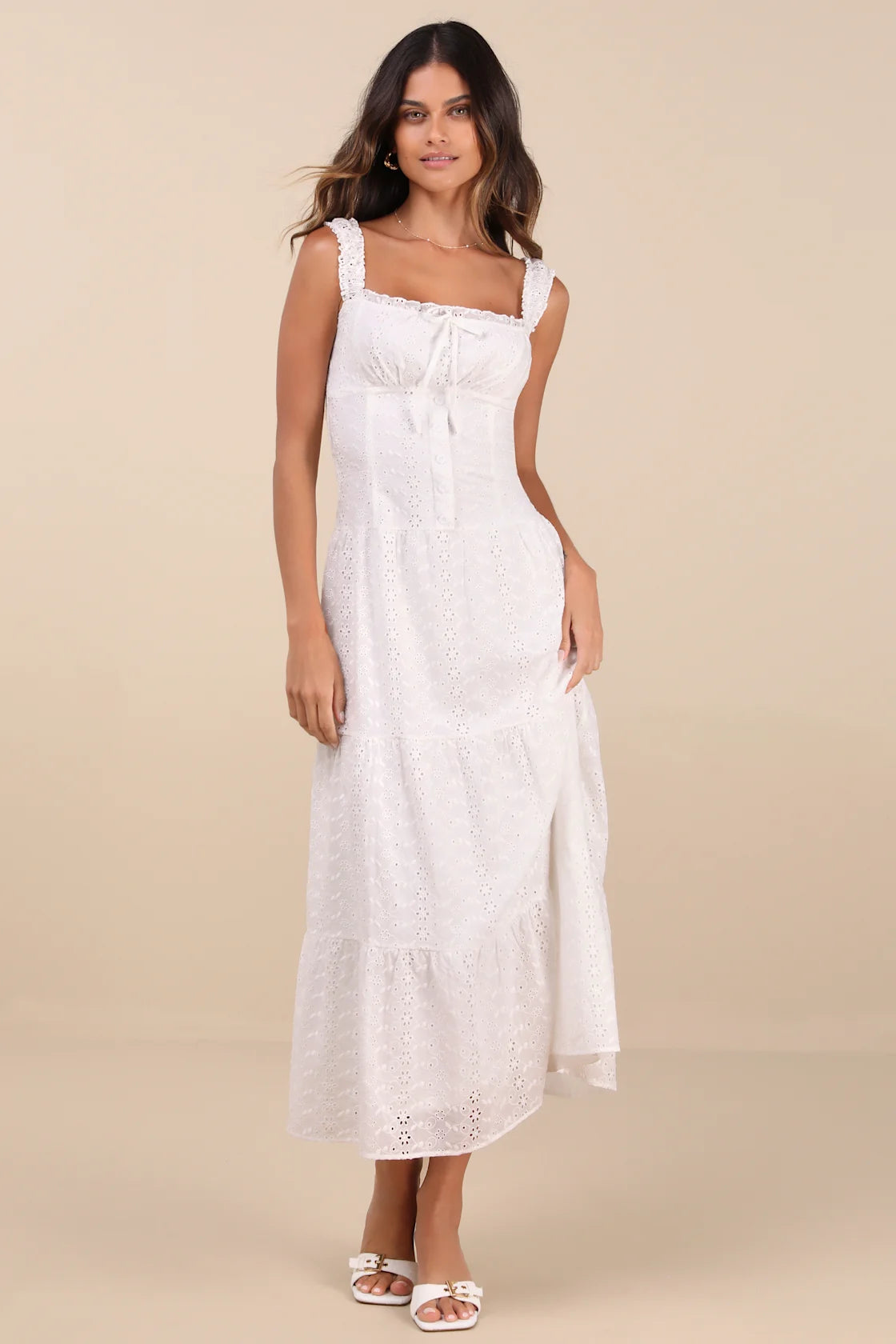 There's nothing like a sunny day spent romanticizing life in this lightweight cotton dress that features a pierced eyelet-embroidered design across the timeless midi silhouette. Elasticized straps support a square neckline, all adorned with ruffled trim atop a fitted bodice with a cute tying detail. The empire silhouette boasts a button placket at the center atop a drop waist that falls to a tiered A-line skirt. Hidden back zipper/clasp.